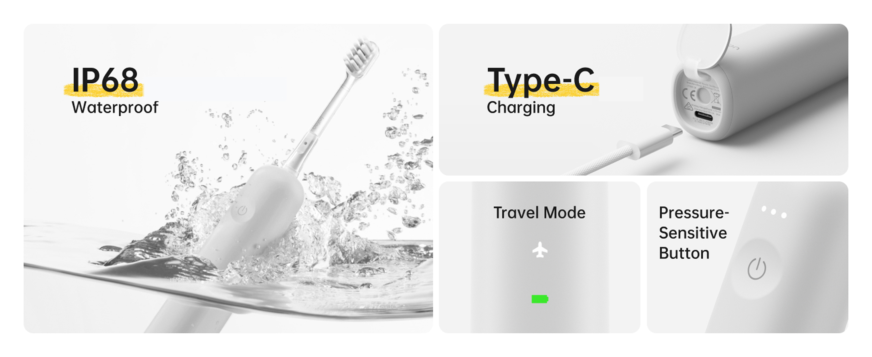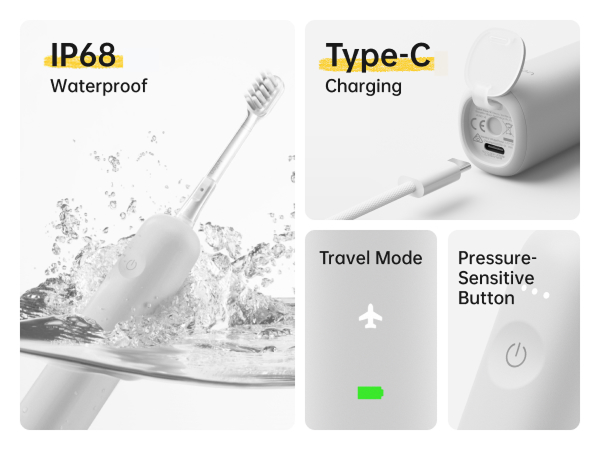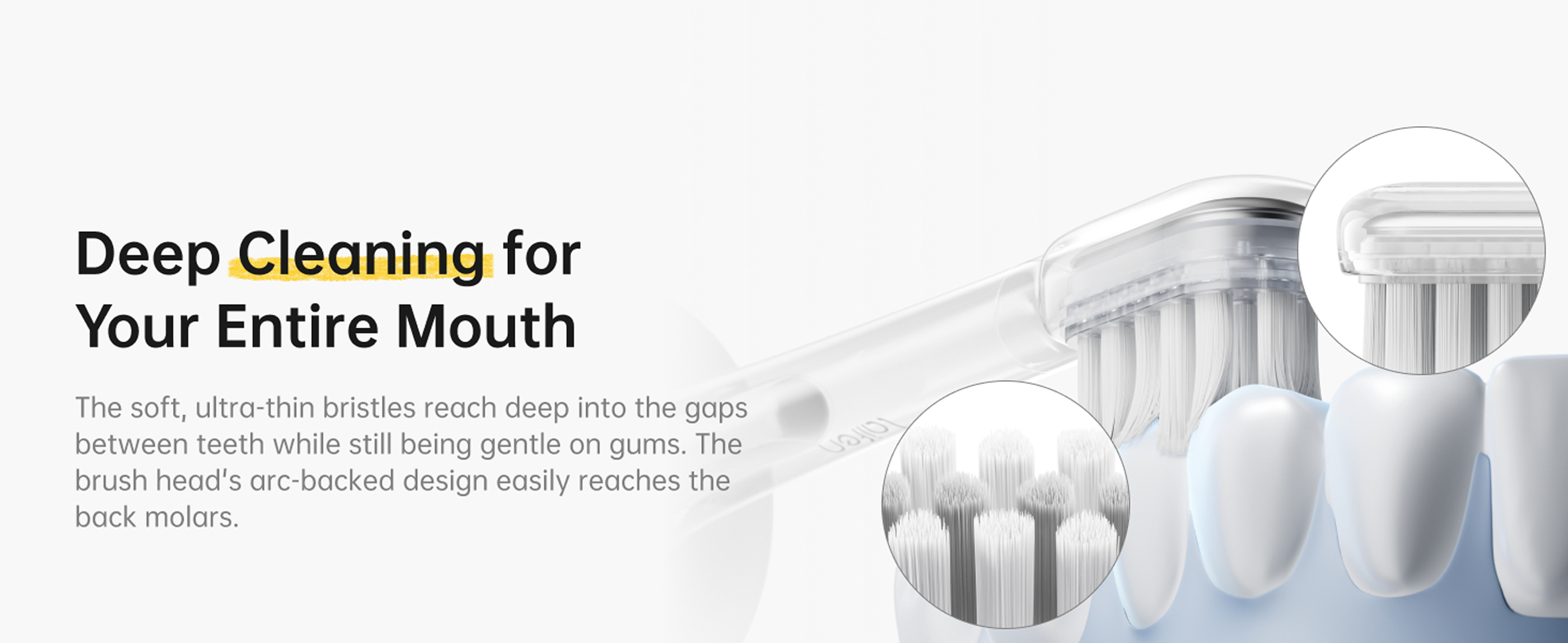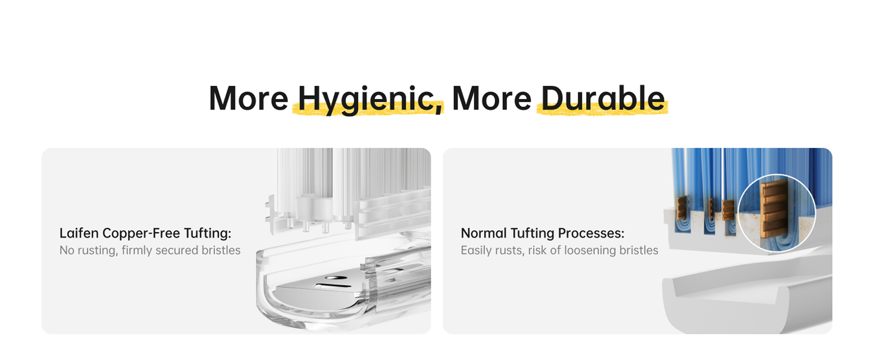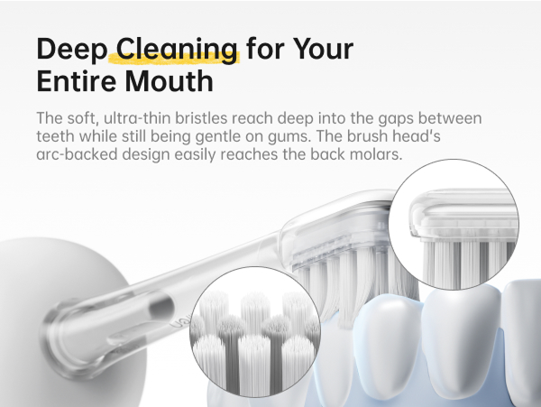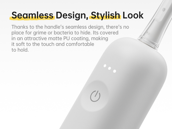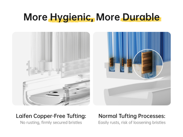 Die Bürstenköpfe sind mit einer weichen, lebensmittelechten TPE-Beschichtung überzogen für ein angenehmes Putzgefühl. Die zahnfleischfreundlichen, ultrafeinen Borsten reinigen Zähne und Zahnfleisch gründlich und sind mittels eines kupferfreien Tufting-Verfahrens fest verankert, um Rostbildung zu verhindern.