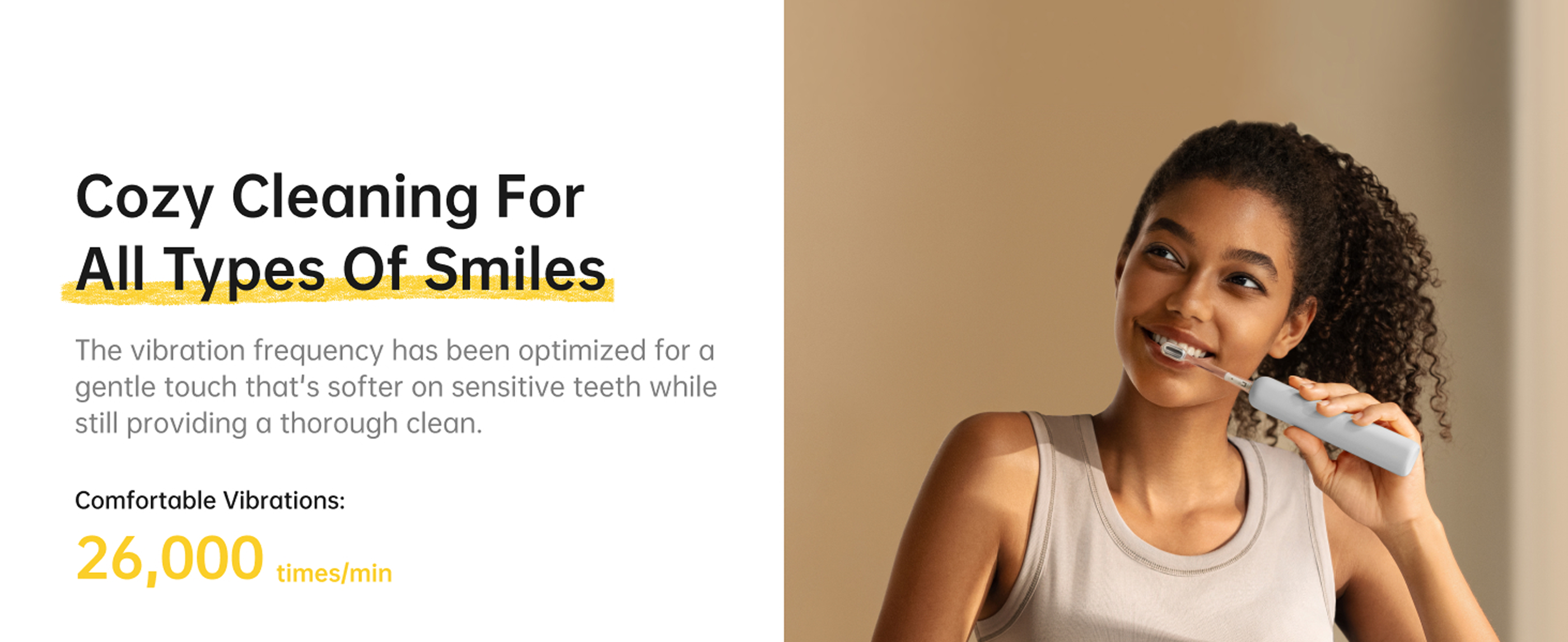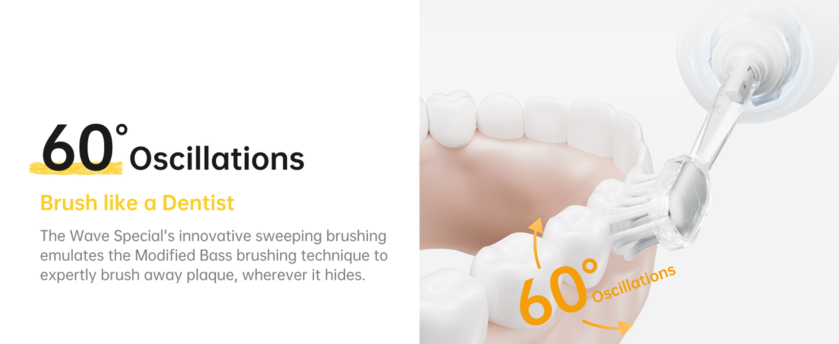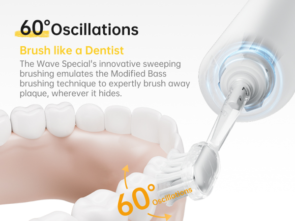 Die 60°-Oszillationen der Wave Special imitieren mühelos die zahnärztlich empfohlene Modified-Bass-Technik für eine überlegene Reinigung. Die sanften 26.000 Vibrationen/Min. eignen sich ideal für alle Nutzer – auch für Anfänger und Menschen mit empfindlichen Zähnen.
