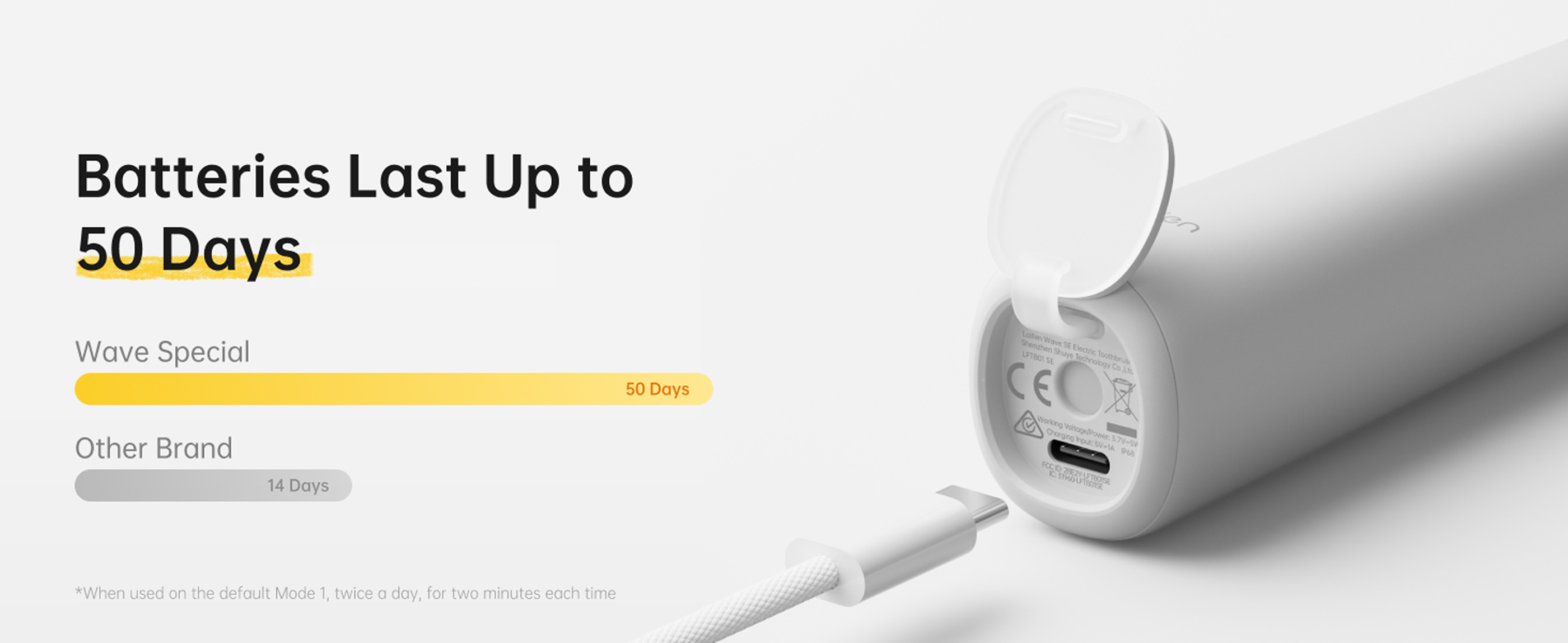 | Akkulaufzeit | Eine Ladung hält bis zu 50 Tage (bei zweimal täglicher Anwendung im Modus 1 für jeweils zwei Minuten). |