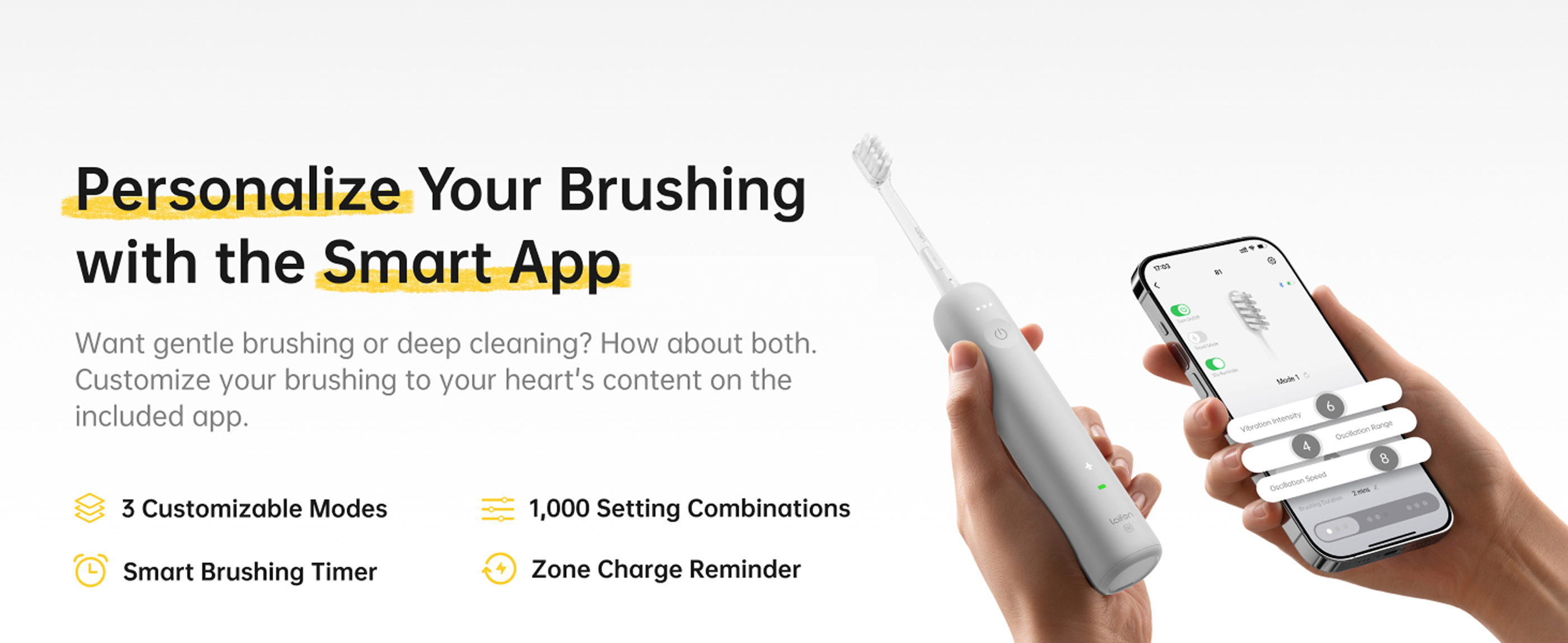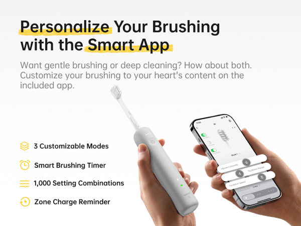 Die Laifen-App ermöglicht es Ihnen, Ihr Putzerlebnis mit über 1.000 möglichen Einstellungskombinationen zu personalisieren. Ein intelligenter Putztimer und eine Zonenwechsel-Erinnerung führen Sie zu einem strahlenden Lächeln.